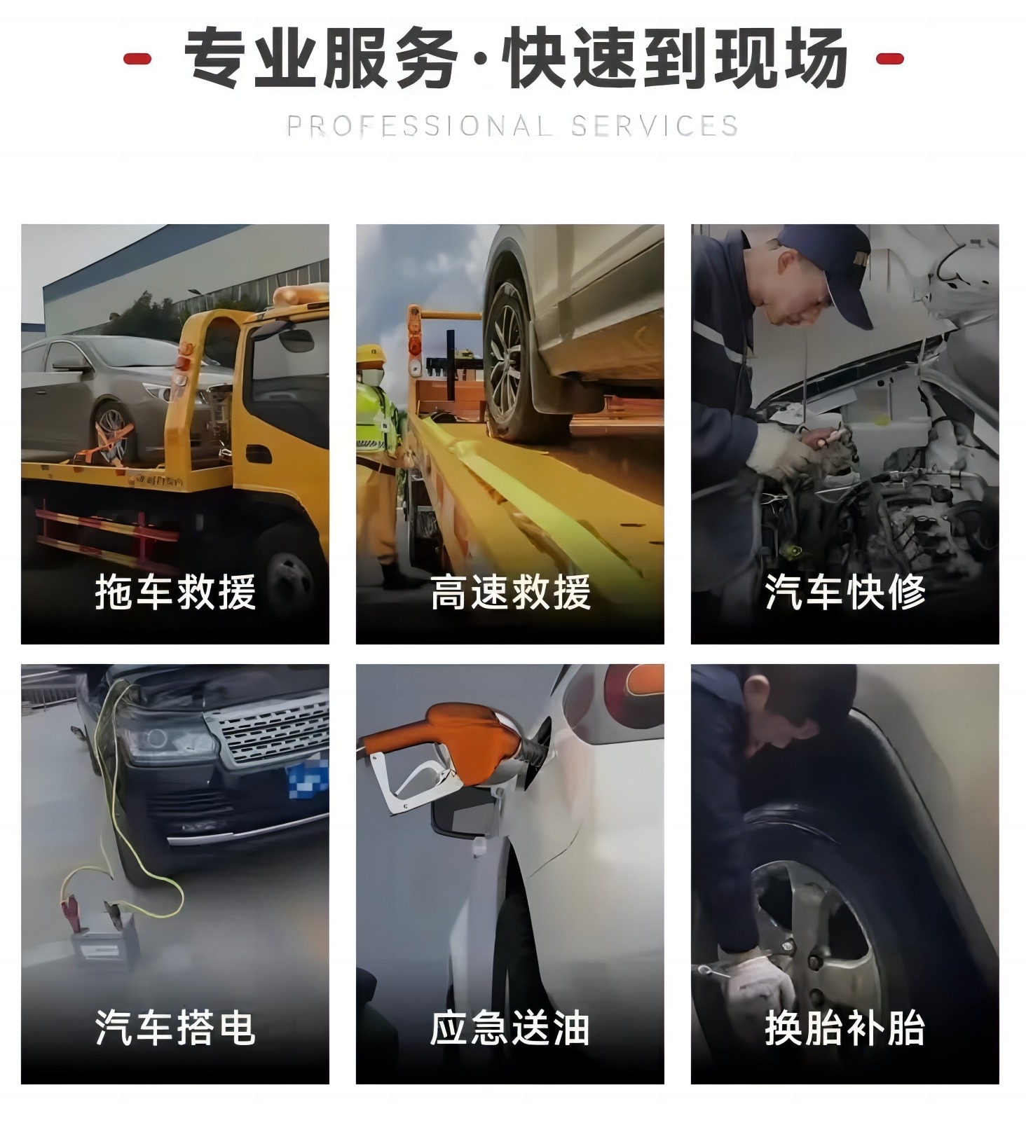 专业为您提供24小时道路救援:拖车服务、补胎换胎、汽车搭电、送油救援、困境救援、高速救援服务